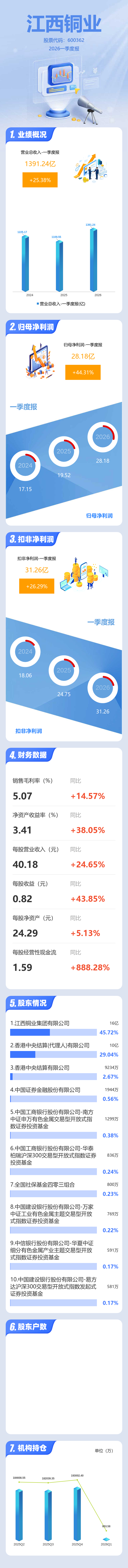 证券之星消息,江西铜业2026年一季报显示,一季度公司主营收入1391.24亿元,同比上升25.39%;归母净利润28.18亿元,同比上升44.31%;扣非净利润31.26亿元,同比上升26.3%;负债率62.47%,投资收益-18.19亿元,财务费用4.72亿元,毛利率5.07%。