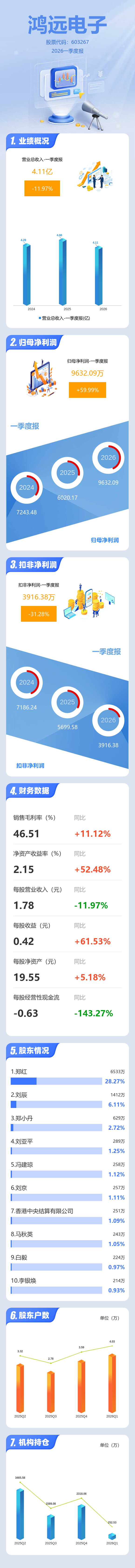 证券之星消息,鸿远电子2026年一季报显示,一季度公司主营收入4.11亿元,同比下降11.98%;归母净利润9632.09万元,同比上升60.0%;扣非净利润3916.38万元,同比下降31.29%;负债率13.66%,投资收益-46.12万元,财务费用-44.2万元,毛利率46.51%。