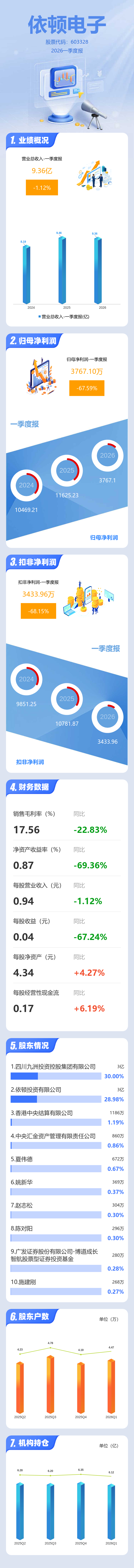 证券之星消息,依顿电子2026年一季报显示,一季度公司主营收入9.36亿元,同比下降1.13%;归母净利润3767.1万元,同比下降67.6%;扣非净利润3433.96万元,同比下降68.15%;负债率36.95%,投资收益1006.08万元,财务费用2039.4万元,毛利率17.56%。