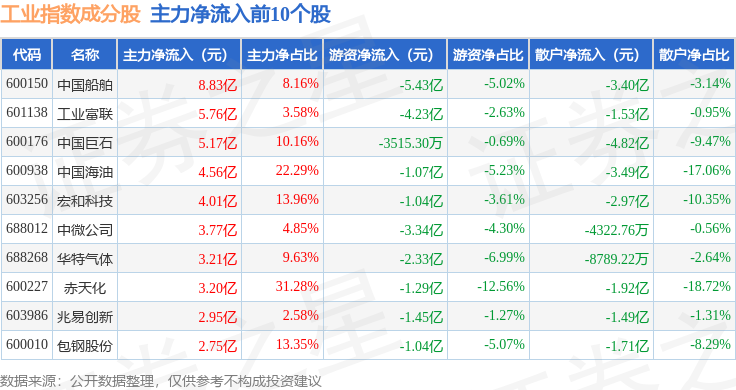 资金流向方面,工业指数(000004)成份股当日主力资金净流出合计295.56亿元,游资资金净流入合计75.95亿元,散户资金净流入合计219.61亿元。成份股资金流向详情见下表: