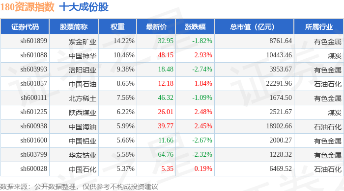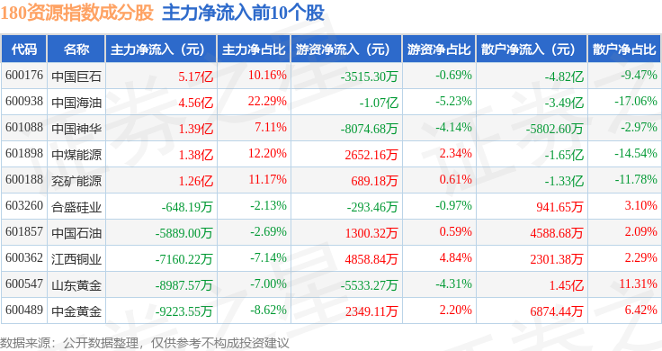 资金流向方面,180资源(000026)指数成份股当日主力资金净流出合计12.33亿元,游资资金净流入合计1.54亿元,散户资金净流入合计10.79亿元。成份股资金流向详情见下表: