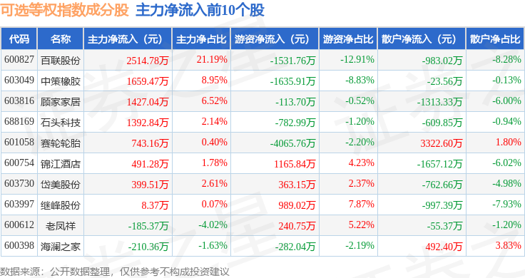 资金流向方面,可选等权(000073)指数成份股当日主力资金净流出合计22.68亿元,游资资金净流入合计5.93亿元,散户资金净流入合计16.74亿元。成份股资金流向详情见下表: