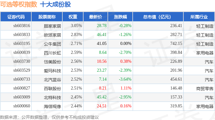 可选等权(000073)指数十大成份股详情如下: