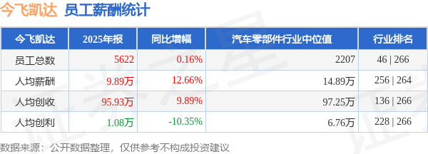证券之星消息,4月29日今飞凯达公布2025年年报,当年营收53.93亿元,同比增10.06%;净利润为5994.2万元,同比减10.52%。根据财报数据披露,当年公司员工总数5622人,同比增0.16%;人均薪酬9.89万元,同比增12.66%;人均创收95.93万元,同比增9.89%;人均创利1.08万元,同比减10.35%;公司员工薪酬统计见下表: