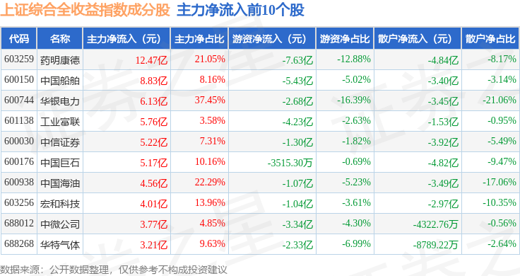 资金流向方面,上证综合全收益(000888)指数成份股当日主力资金净流出合计298.4亿元,游资资金净流入合计66.47亿元,散户资金净流入合计231.93亿元。成份股资金流向详情见下表: