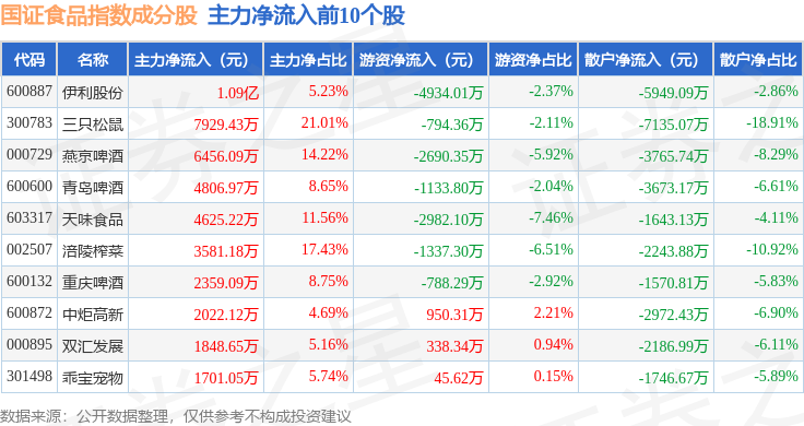 资金流向方面,国证食品(399396)指数成份股当日主力资金净流出合计5.48亿元,游资资金净流入合计3.68亿元,散户资金净流入合计1.8亿元。成份股资金流向详情见下表: