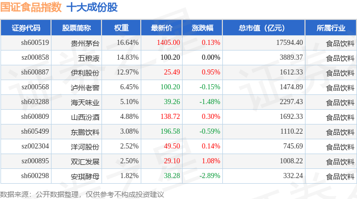 证券之星消息,4月28日,国证食品(399396)指数报收于16289.36点,涨0.07%,成交245.93亿元,换手率1.69%。当日该指数成份股中,上涨的有21家,天味食品以10.01%的涨幅领涨,下跌的有27家,中宠股份以4.33%的跌幅领跌。
