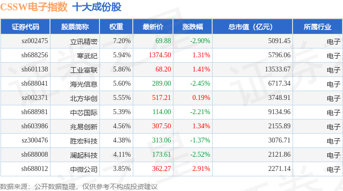 证券之星消息,4月28日,CSSW电子(399811)指数报收于6722.72点,跌1.13%,成交2273.61亿元,换手率2.77%。当日该指数成份股中,上涨的有14家,三环集团以7.89%的涨幅领涨,下跌的有46家,盛美上海以11.74%的跌幅领跌。