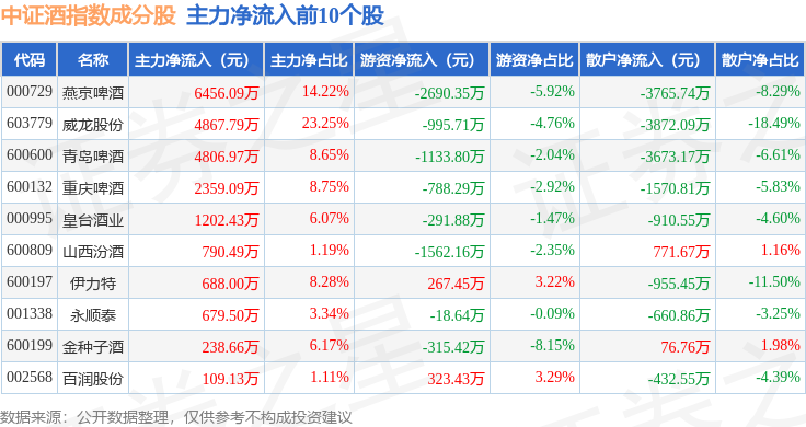 资金流向方面,中证酒(399987)指数成份股当日主力资金净流出合计3.21亿元,游资资金净流入合计2.28亿元,散户资金净流入合计9376.09万元。成份股资金流向详情见下表:
