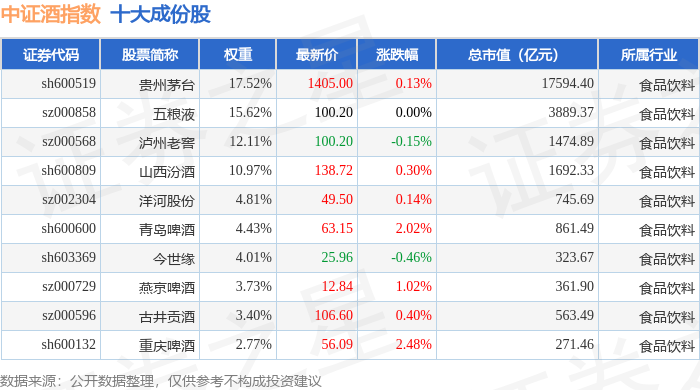 证券之星消息,4月28日,中证酒(399987)指数报收于4497.64点,涨0.09%,成交116.93亿元,换手率0.95%。当日该指数成份股中,上涨的有14家,威龙股份以10.0%的涨幅领涨,下跌的有12家,会稽山以4.33%的跌幅领跌。
