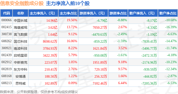 资金流向方面,信息安全(399994)指数成份股当日主力资金净流出合计20.2亿元,游资资金净流入合计5.56亿元,散户资金净流入合计14.63亿元。成份股资金流向详情见下表: