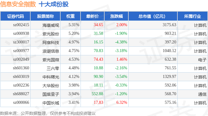 证券之星消息,4月28日,信息安全(399994)指数报收于1831.61点,跌2.18%,成交552.57亿元,换手率3.41%。当日该指数成份股中,上涨的有7家,中国长城以6.32%的涨幅领涨,下跌的有54家,安恒信息以10.24%的跌幅领跌。
