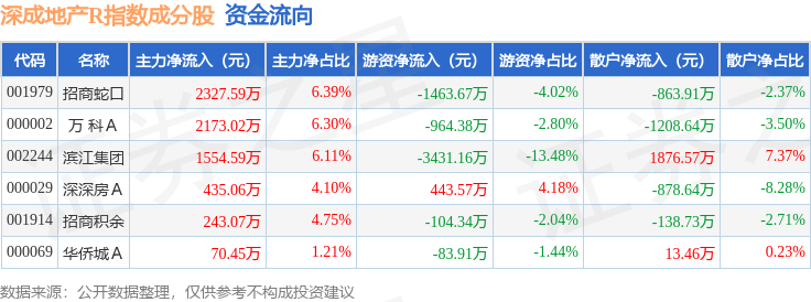 资金流向方面,深成地产R(471001)指数成份股当日主力资金净流入合计6803.78万元,游资资金净流出合计5603.9万元,散户资金净流出合计1199.88万元。成份股资金流向详情见下表:
