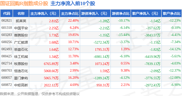 资金流向方面,国证回购R(480063)指数成份股当日主力资金净流出合计8.24亿元,游资资金净流入合计4.25亿元,散户资金净流入合计3.99亿元。成份股资金流向详情见下表:
