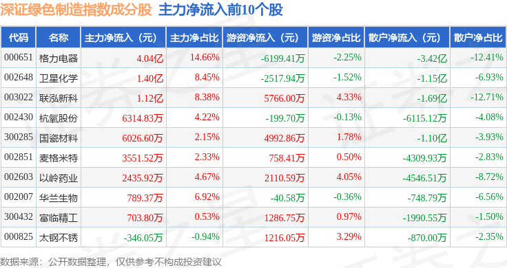 资金流向方面,深证绿色制造(970069)指数成份股当日主力资金净流出合计64.54亿元,游资资金净流入合计29.89亿元,散户资金净流入合计34.65亿元。成份股资金流向详情见下表: