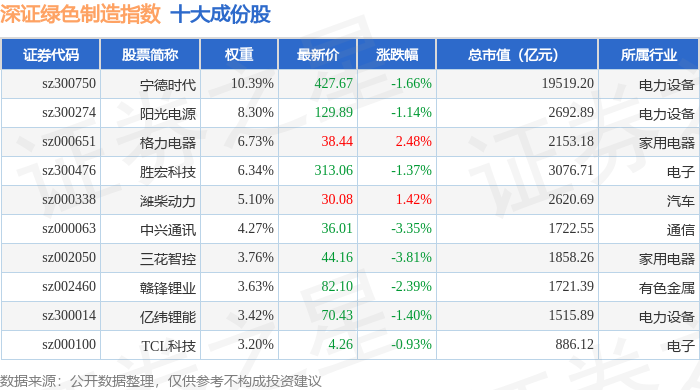 证券之星消息,4月28日,深证绿色制造(970069)指数报收于2010.26点,跌1.42%,成交1270.18亿元,换手率2.45%。当日该指数成份股中,上涨的有9家,杭氧股份以6.07%的涨幅领涨,下跌的有41家,德赛西威以7.11%的跌幅领跌。