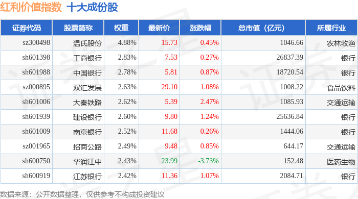 红利价值(980103)指数十大成份股详情如下:
