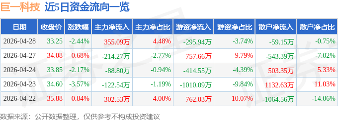 证券之星消息,截至2026年4月28日收盘,巨一科技(688162)报收于33.25元,下跌2.44%,换手率1.72%,成交量2.36万手,成交额7917.29万元。