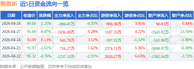 证券之星消息,截至2026年4月28日收盘,赛恩斯(688480)报收于89.6元,下跌2.25%,换手率2.4%,成交量2.29万手,成交额2.06亿元。