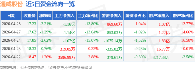 证券之星消息,截至2026年4月28日收盘,通威股份(600438)报收于17.23元,下跌2.21%,换手率1.08%,成交量48.41万手,成交额8.4亿元。