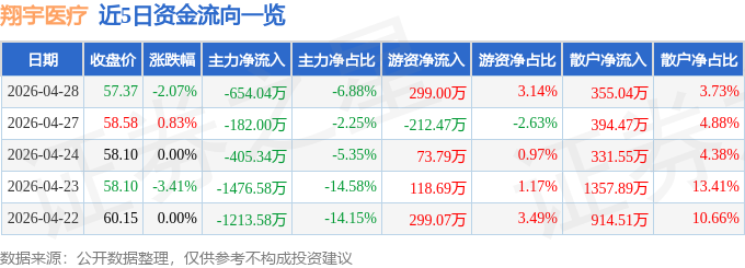证券之星消息,截至2026年4月28日收盘,翔宇医疗(688626)报收于57.37元,下跌2.07%,换手率1.03%,成交量1.64万手,成交额9512.97万元。