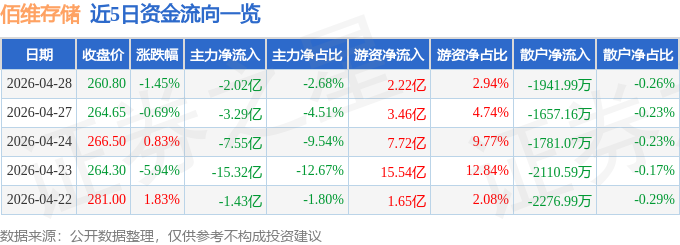 证券之星消息,截至2026年4月28日收盘,佰维存储(688525)报收于260.8元,下跌1.45%,换手率5.99%,成交量28.18万手,成交额75.43亿元。