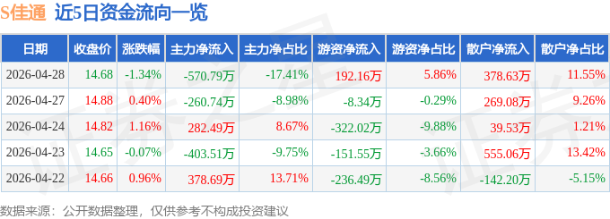 证券之星消息,截至2026年4月28日收盘,S佳通(600182)报收于14.68元,下跌1.34%,换手率1.31%,成交量2.22万手,成交额3277.85万元。
