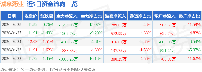 证券之星消息,截至2026年4月28日收盘,诚意药业(603811)报收于11.82元,下跌0.76%,换手率2.13%,成交量6.98万手,成交额8313.88万元。