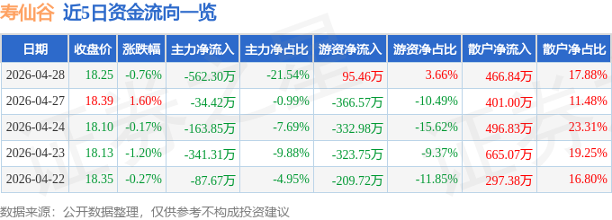 证券之星消息,截至2026年4月28日收盘,寿仙谷(603896)报收于18.25元,下跌0.76%,换手率0.72%,成交量1.43万手,成交额2610.26万元。