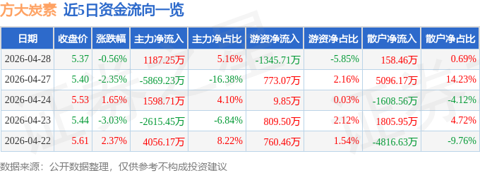 证券之星消息,截至2026年4月28日收盘,方大炭素(600516)报收于5.37元,下跌0.56%,换手率1.06%,成交量42.71万手,成交额2.3亿元。