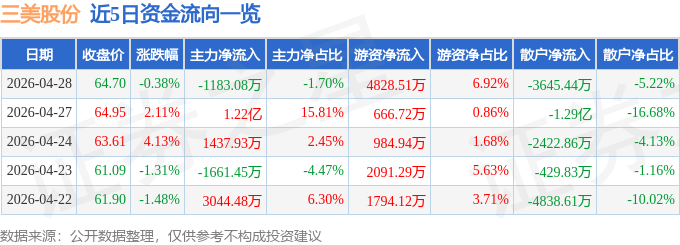 证券之星消息,截至2026年4月28日收盘,三美股份(603379)报收于64.7元,下跌0.38%,换手率1.77%,成交量10.8万手,成交额6.98亿元。