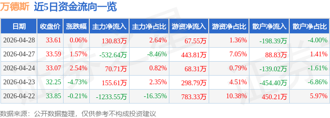 证券之星消息,截至2026年4月28日收盘,万德斯(688178)报收于33.61元,上涨0.06%,换手率1.75%,成交量1.49万手,成交额4964.74万元。