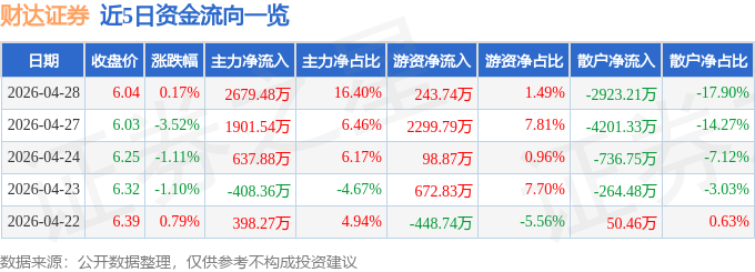 证券之星消息,截至2026年4月28日收盘,财达证券(600906)报收于6.04元,上涨0.17%,换手率1.27%,成交量27.06万手,成交额1.63亿元。