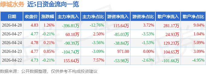 证券之星消息,截至2026年4月28日收盘,绿城水务(601368)报收于4.83元,上涨1.26%,换手率0.73%,成交量6.47万手,成交额3110.21万元。
