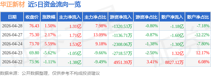 证券之星消息,截至2026年4月28日收盘,华正新材(603186)报收于76.43元,上涨1.5%,换手率13.55%,成交量21.25万手,成交额16.42亿元。