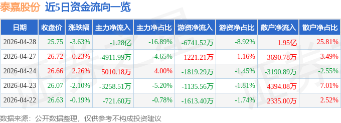 证券之星消息,截至2026年4月28日收盘,泰嘉股份(002843)报收于25.75元,下跌3.63%,换手率11.57%,成交量28.96万手,成交额7.56亿元。