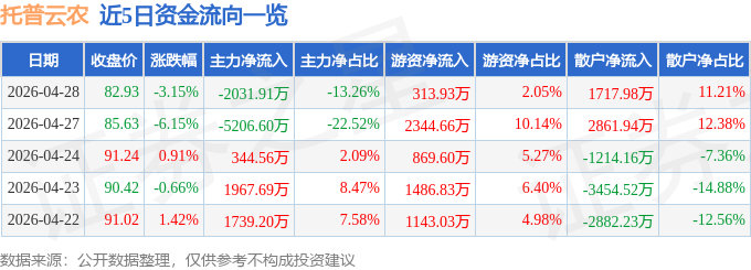 证券之星消息,截至2026年4月28日收盘,托普云农(301556)报收于82.93元,下跌3.15%,换手率6.24%,成交量1.84万手,成交额1.53亿元。
