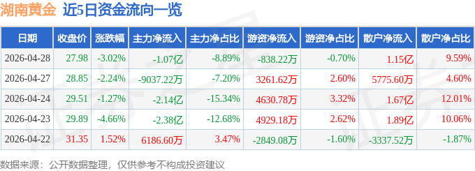 证券之星消息,截至2026年4月28日收盘,湖南黄金(002155)报收于27.98元,下跌3.02%,换手率2.75%,成交量42.93万手,成交额12.02亿元。