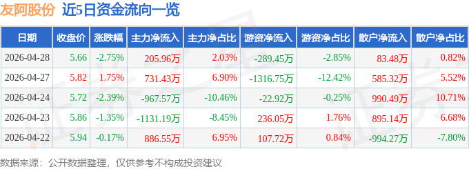 证券之星消息,截至2026年4月28日收盘,友阿股份(002277)报收于5.66元,下跌2.75%,换手率1.27%,成交量17.77万手,成交额1.02亿元。