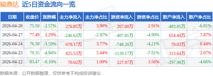 证券之星消息,截至2026年4月28日收盘,骏鼎达(301538)报收于75.5元,下跌2.57%,换手率3.03%,成交量9444.0手,成交额7107.28万元。