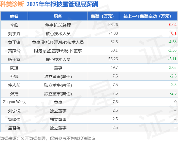 证券之星消息,科美诊断发布2025年年报,数据显示:公司主营收入3.33亿元,同比减23.75%。归母净利润为4391.25万元,同比减65.44%。扣非净利润为2657.26万元,同比减73.62%。当年公司员工总数580人,同比减7.79%。人均薪酬25.0万元(注:"人均薪酬"根据定期报告中"应付职工薪酬"附注的本期增加值 / 员工总数计算而来),同比减7.01%。人均创收57.36万元,同比减17.31%。人均创利7.57万元,同比减62.52%。其中管理层薪酬总额为437.2万元,同比上一年减18.51%,薪酬最高的为董事长,总经理李临,薪酬96.26万元。