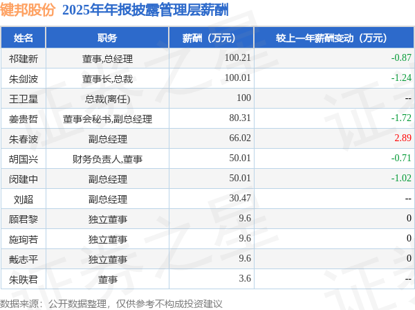 证券之星消息,键邦股份发布2025年年报,数据显示:公司主营收入6.19亿元,同比减8.01%。归母净利润为1.36亿元,同比减13.84%。扣非净利润为1.22亿元,同比减17.41%。当年公司员工总数348人,同比增1.16%。人均薪酬13.22万元(注:"人均薪酬"根据定期报告中"应付职工薪酬"附注的本期增加值 / 员工总数计算而来),同比减9.32%。人均创收177.81万元,同比减9.07%。人均创利39.04万元,同比减14.83%。其中管理层薪酬总额为609.44万元,同比上一年增6.57%,薪酬最高的为董事,总经理祁建新,薪酬100.21万元。