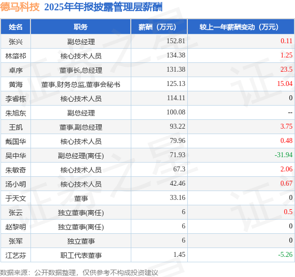 证券之星消息,德马科技发布2025年年报,数据显示:公司主营收入16.85亿元,同比增15.63%。归母净利润为9516.21万元,同比增2.86%。扣非净利润为7950.01万元,同比减4.41%。当年公司员工总数1374人,同比增15.08%。人均薪酬21.77万元(注:"人均薪酬"根据定期报告中"应付职工薪酬"附注的本期增加值 / 员工总数计算而来),同比减5.46%。人均创收122.65万元,同比增0.48%。人均创利6.51万元,同比减12.6%。其中管理层薪酬总额为1165.37万元,同比上一年减1.03%,薪酬最高的为副总经理张兴,薪酬152.81万元。