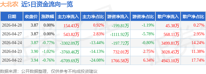 证券之星消息,截至2026年4月28日收盘,大北农(002385)报收于3.87元,上涨0.0%,换手率1.23%,成交量43.43万手,成交额1.68亿元。