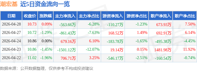 证券之星消息,截至2026年4月28日收盘,潮宏基(002345)报收于10.73元,上涨0.09%,换手率0.96%,成交量8.33万手,成交额8979.99万元。