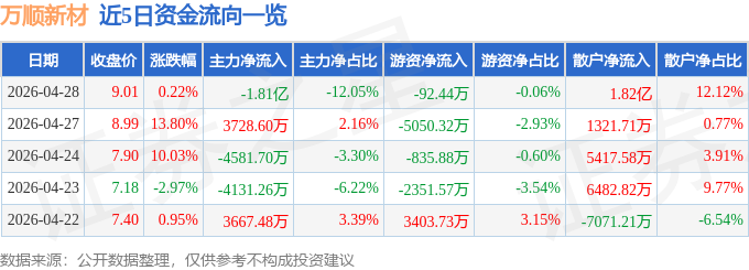 证券之星消息,截至2026年4月28日收盘,万顺新材(300057)报收于9.01元,上涨0.22%,换手率21.51%,成交量164.21万手,成交额15.01亿元。