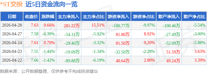 证券之星消息,截至2026年4月28日收盘,*ST交投(002200)报收于7.63元,上涨0.66%,换手率1.22%,成交量2.38万手,成交额1813.08万元。