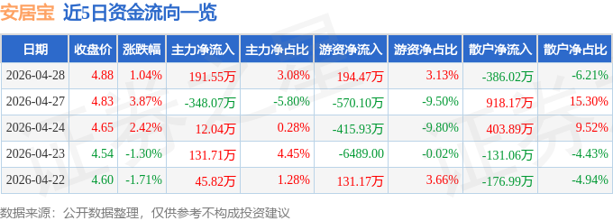 证券之星消息,截至2026年4月28日收盘,安居宝(300155)报收于4.88元,上涨1.04%,换手率3.87%,成交量12.76万手,成交额6217.72万元。