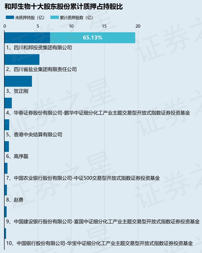 截止本公告日,股东四川和邦投资集团有限公司已累计质押股份12.79亿股,占其持股总数的65.13%。本次质押后和邦生物十大股东的累计质押股份占持股比例(占持股比例的计算以公司最新一期财务报表公布的十大股东的持股总数为基准)见下图: