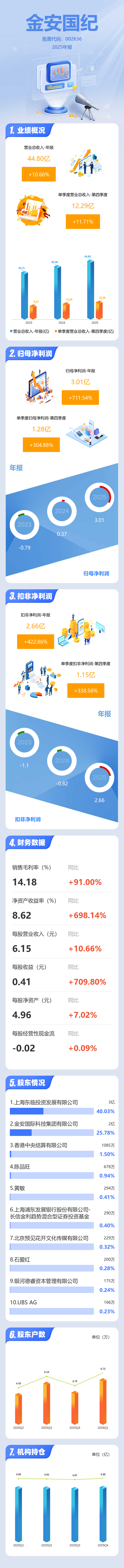 证券之星消息,金安国纪2025年年报显示,当年度公司主营收入44.8亿元,同比上升10.67%;归母净利润3.01亿元,同比上升711.54%;扣非净利润2.66亿元,同比上升422.86%;其中2025年第四季度,公司单季度主营收入12.29亿元,同比上升11.72%;单季度归母净利润1.28亿元,同比上升304.88%;单季度扣非净利润1.15亿元,同比上升338.56%;负债率44.83%,投资收益-5709.58万元,财务费用-4775.3万元,毛利率14.18%。